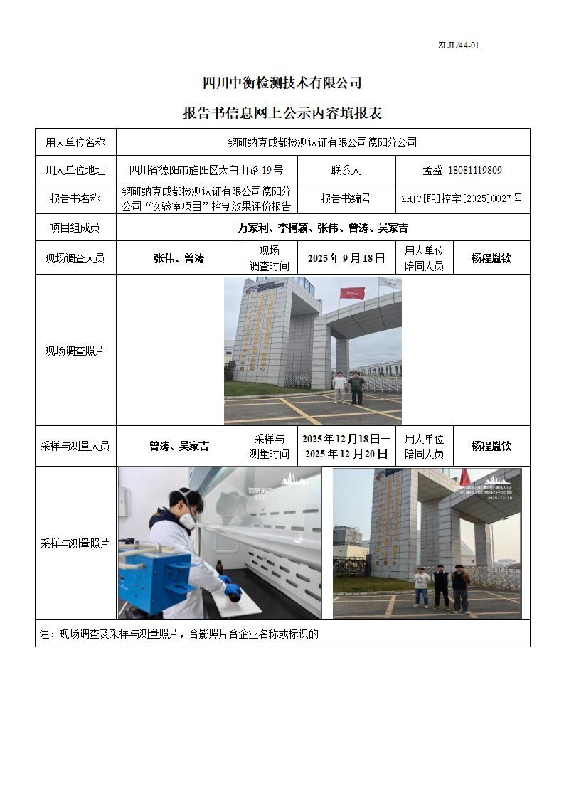 钢研纳克成都检测认证有限公司德阳分公司“实验室项目”控制效果评价