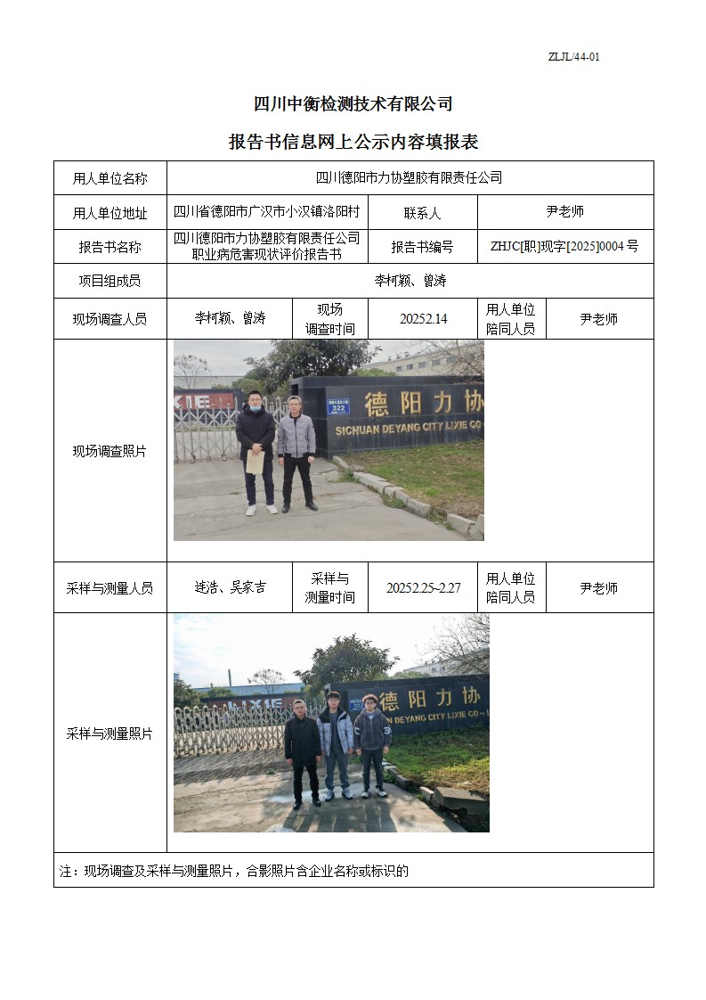 四川德阳市力协塑胶有限责任公司 职业病危害现状评价报告书